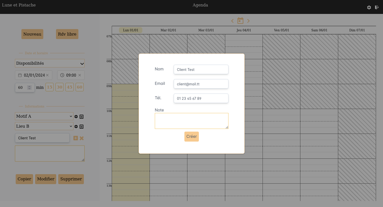Lorsque vous posez un rendez-vous, vous pouvez définir un nouveau client ou intégrer un client déjà enregistré.