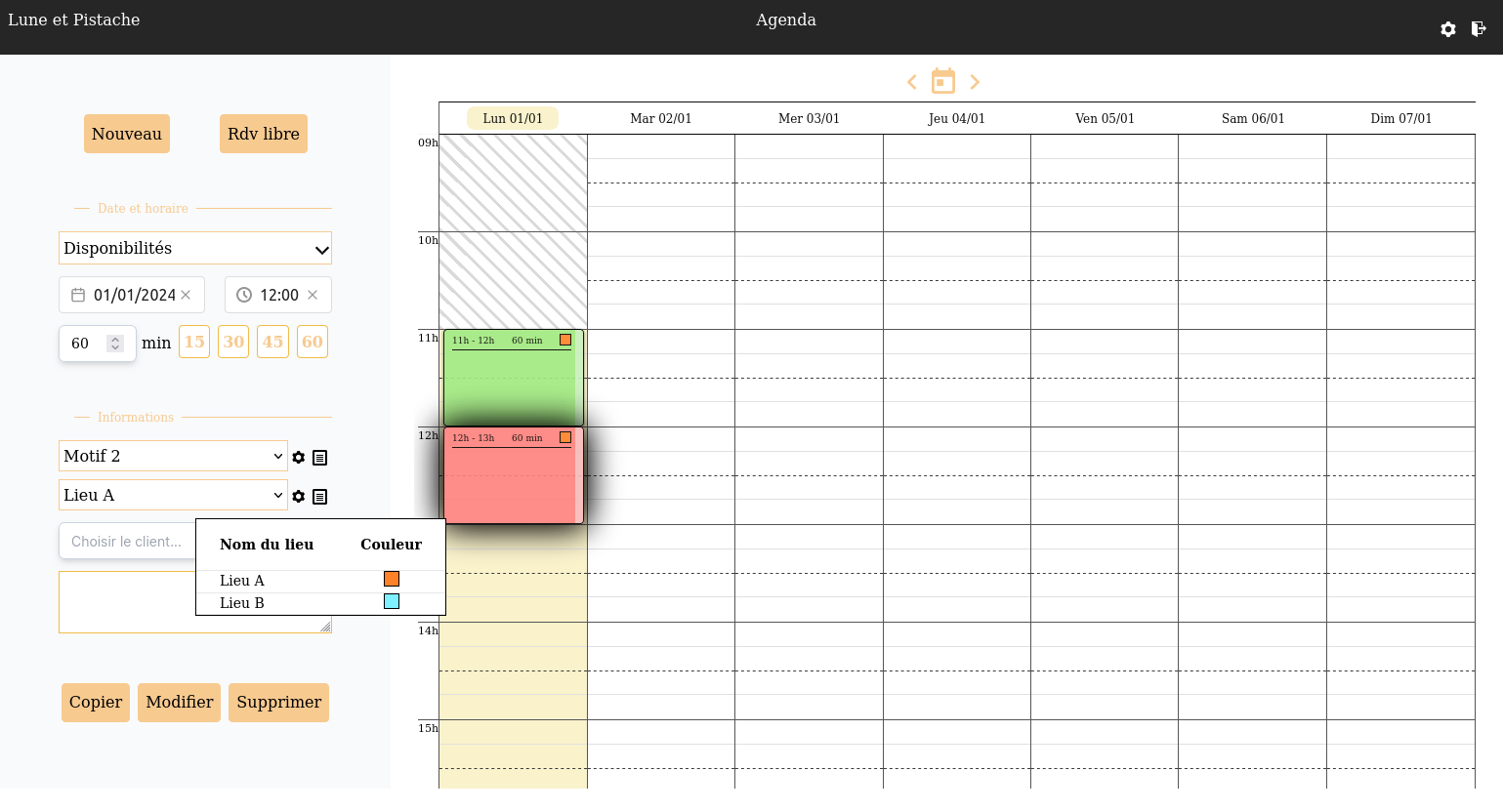 Pour chaque rendez-vous, vous pouvez y associé un motif et un lieu.